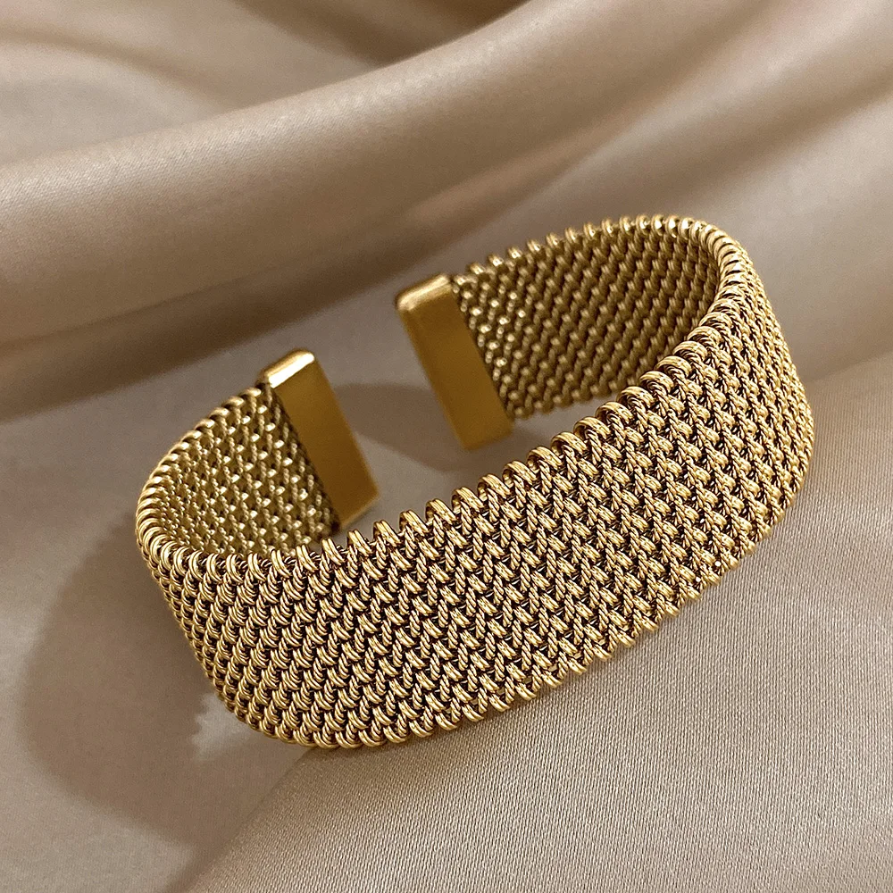 Vintage Weave Golden Cuff Bracelets for Women Elegant Trendy Stainless Steel Chunky Bracelet Bangle Waterproof Jewelry Gifts
